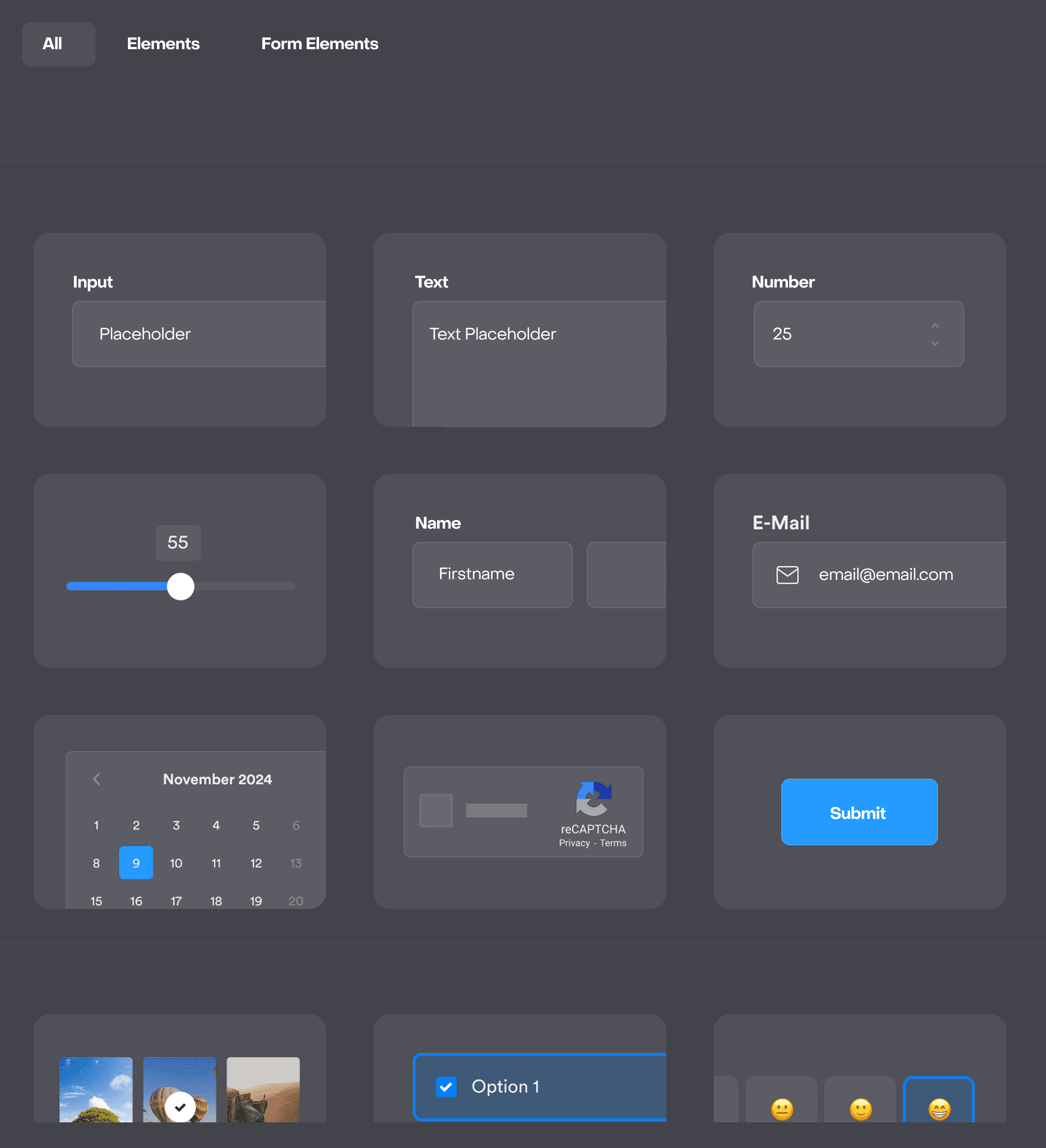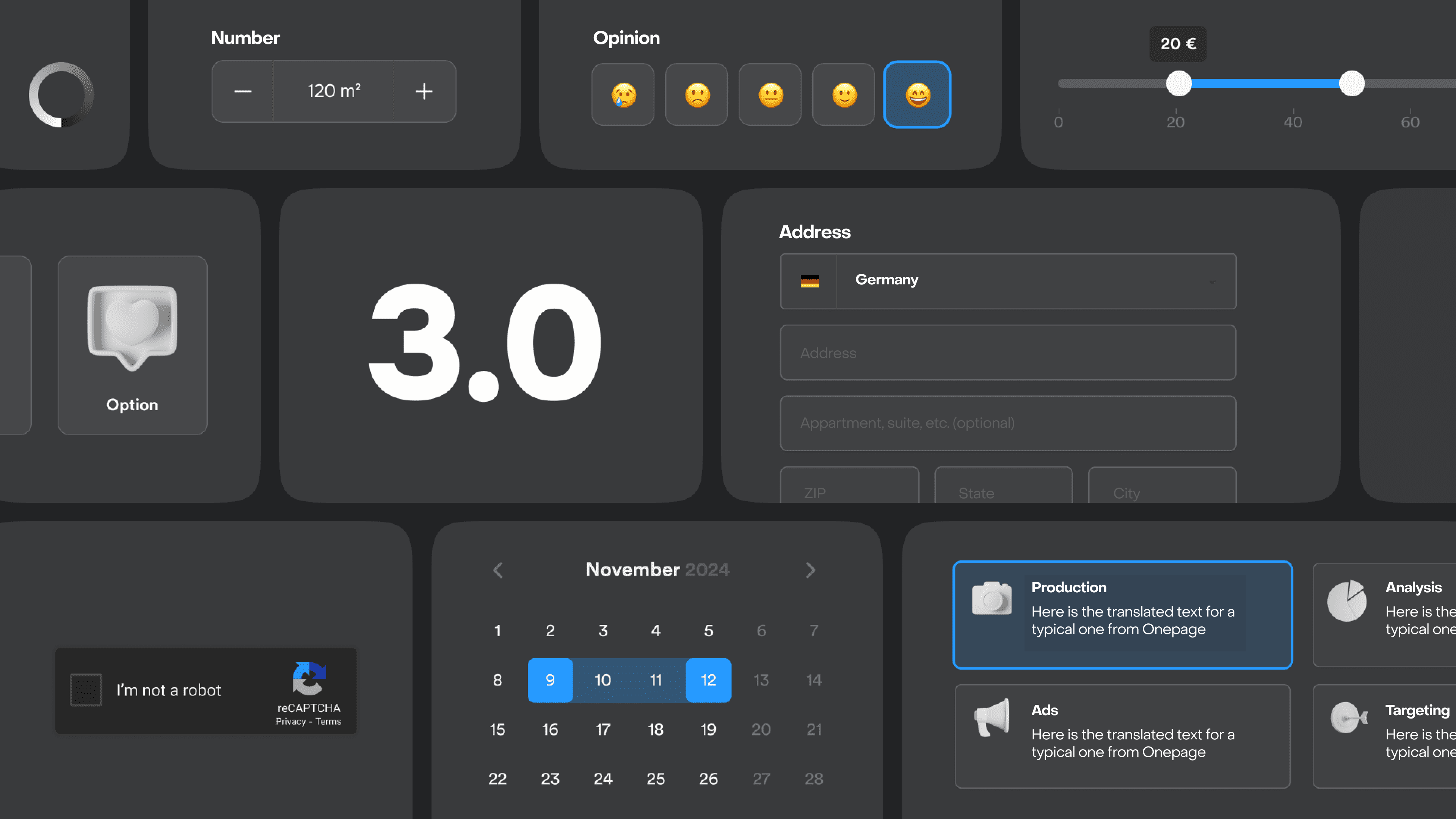 Modern elements for clear decisions instead of pure data entry. Whether range sliders, rating scales, chips, date & time pickers, file uploads or clickable number fields.