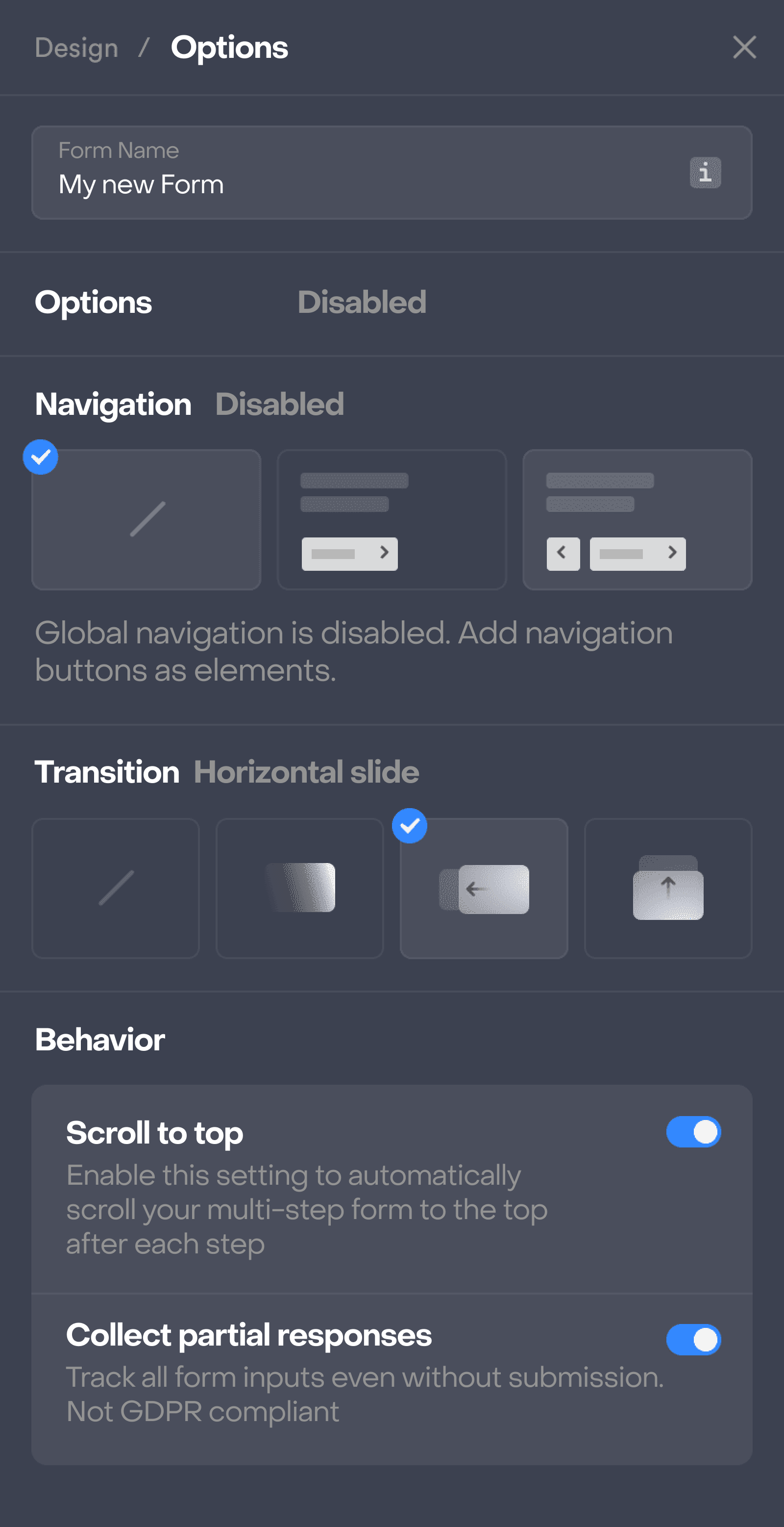 Flexibly control the flow with Next/Back, Next only or completely without navigation buttons.